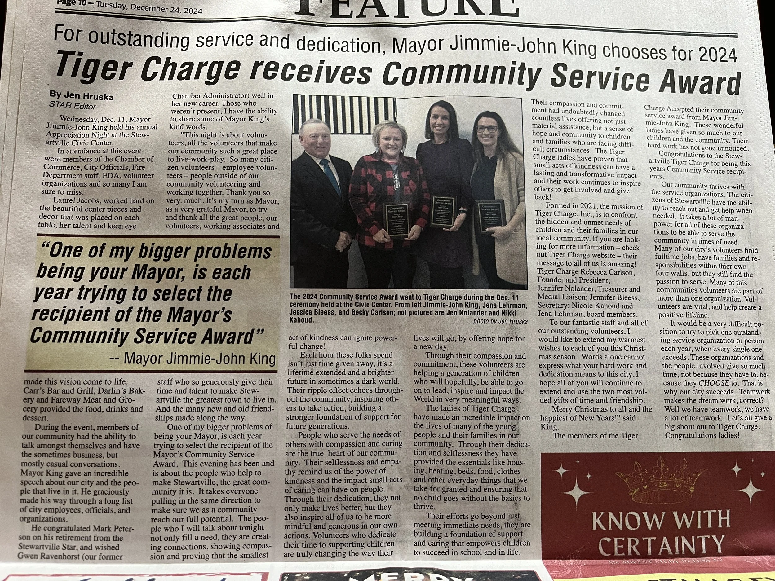 Mayor Jimmie-John King chose The Tiger Charge for the 2024 Community Service Award for outstanding service and dedication!